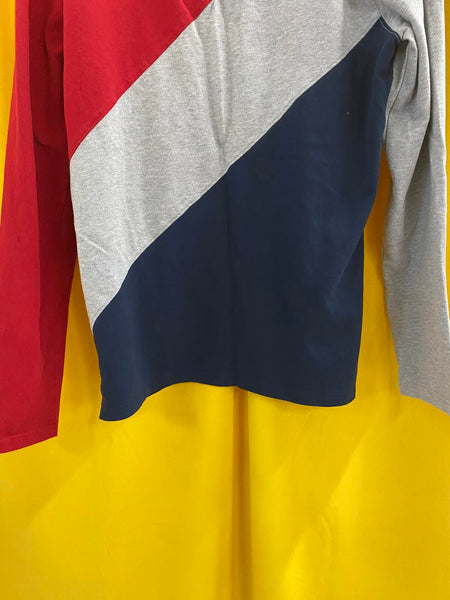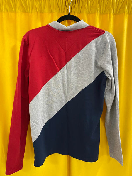 Women's long sleeve polo shirt by Ariat featuring a colorblock design in red, gray, and navy blue.