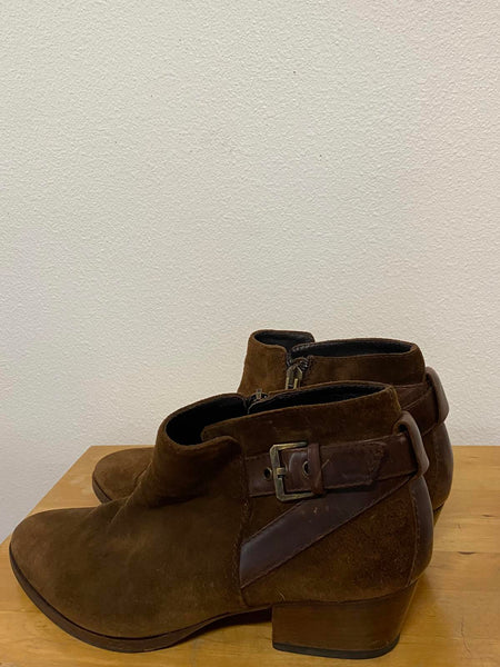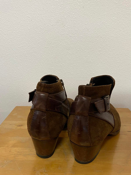 Brown suede women's ankle boots featuring a side zipper for easy wear.