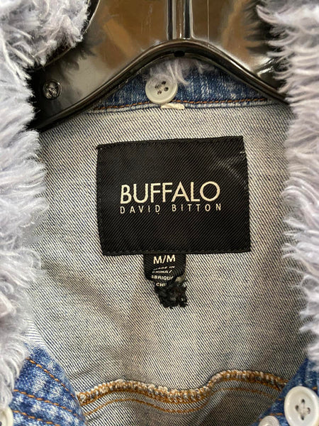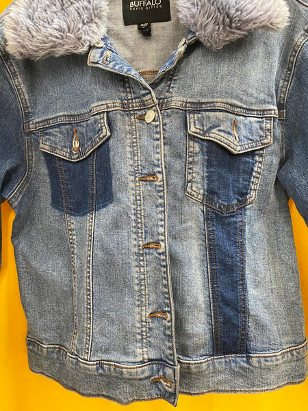Classic denim jacket featuring a soft, plush faux fur light blue collar for added warmth and style.