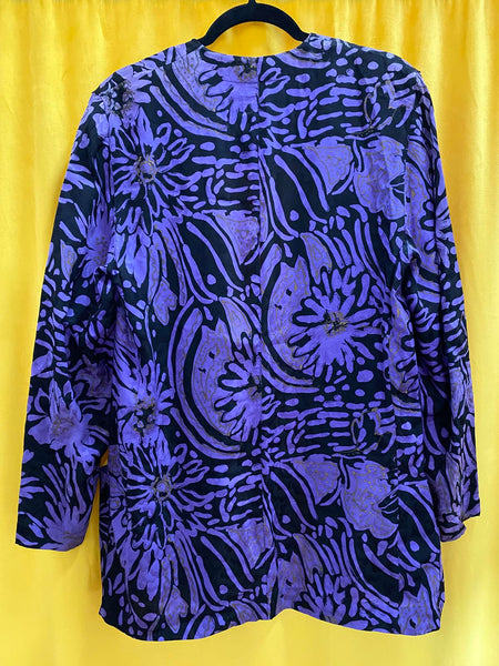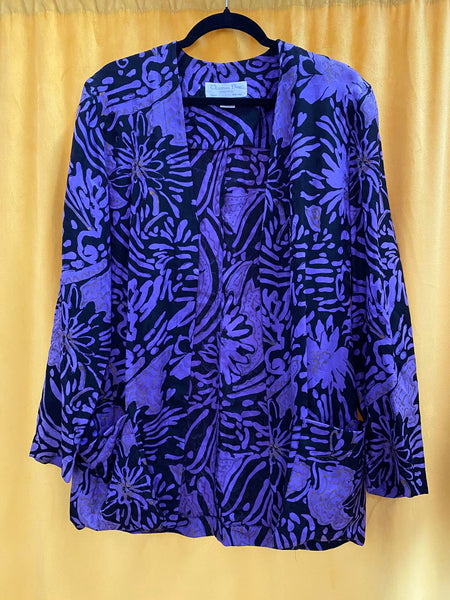 Elegant Christian Dior jacket featuring a purple and black floral pattern with subtle gold accents.