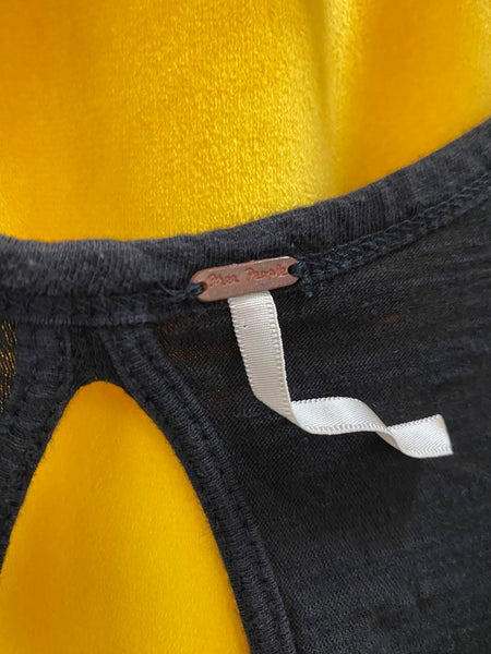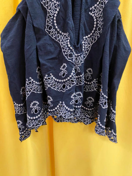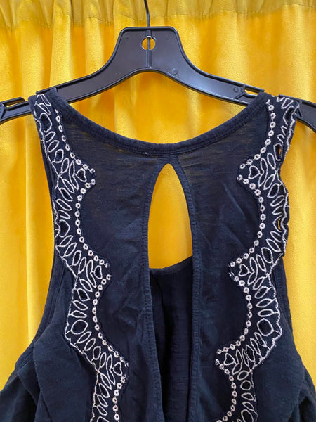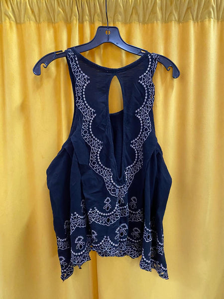Black sleeveless tank top by Free People with white embroidery details along the edges.