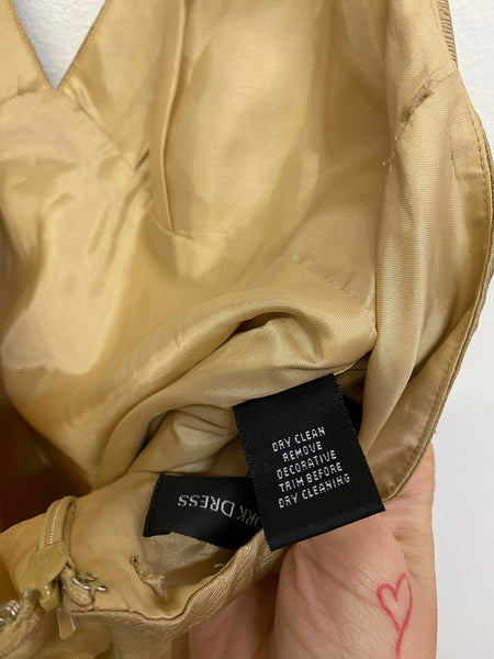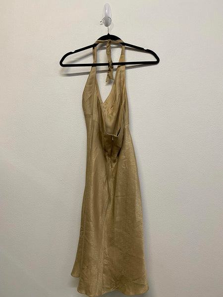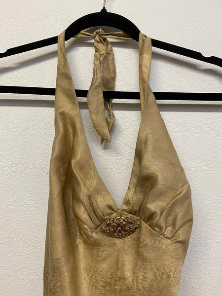 Elegant gold halter neck maxi dress with a deep V neckline.