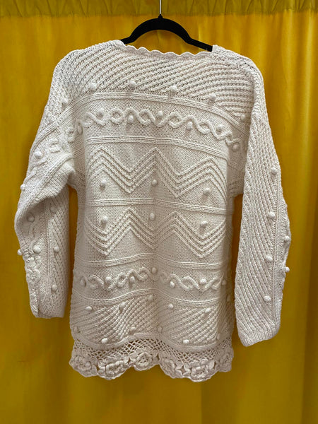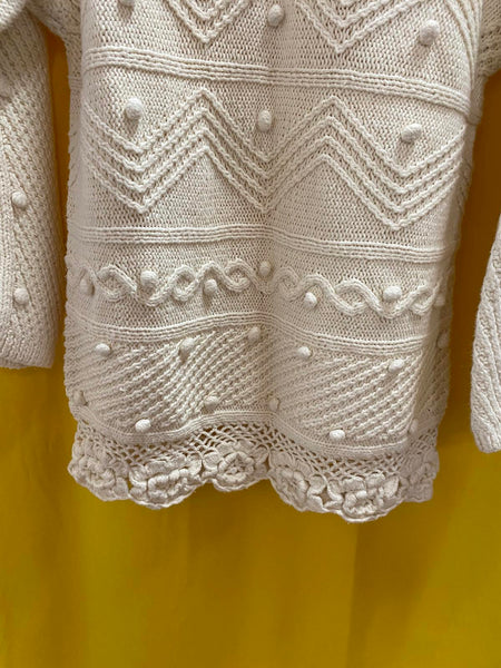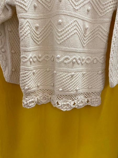 Features intricate knit patterns with bobble detailing and a scalloped hem with floral crochet accents.