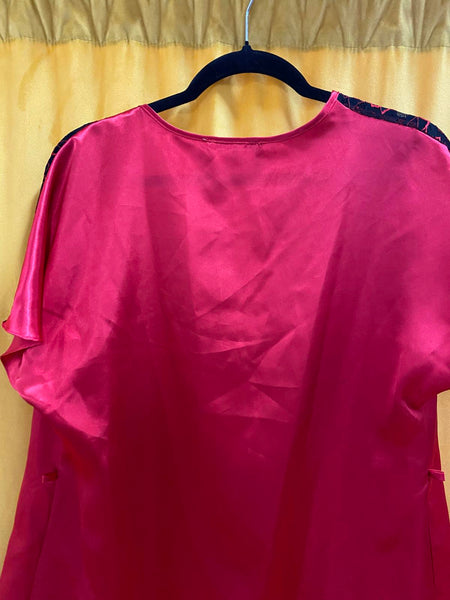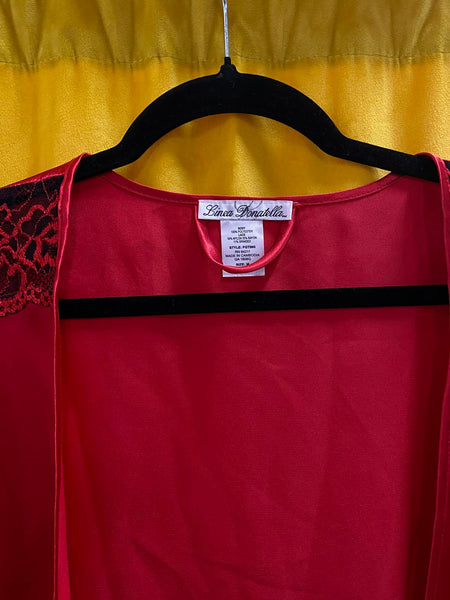 Elegant red satin robe featuring delicate black lace detailing on the shoulders.