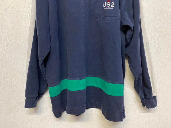Color-block design with navy base, green stripe near hem, and white and red accents on collar and sleeves.