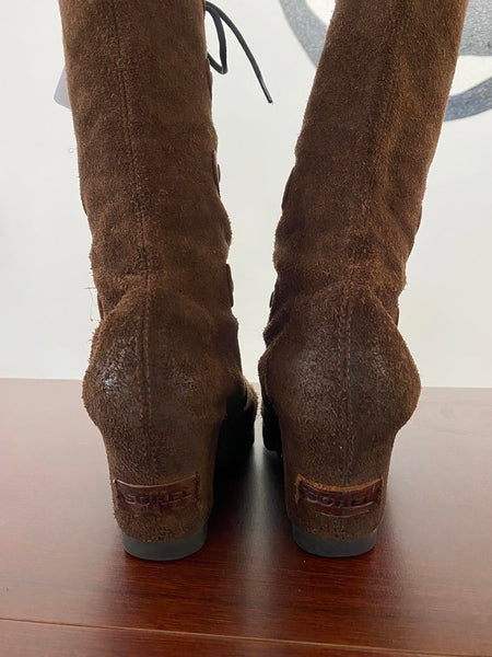 Sorel Joan of Arctic Brown knee-high suede women's lace-up boots featuring multiple leather strap details with bronze metal snap buttons and hardware.