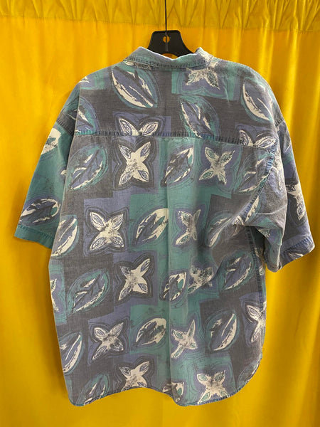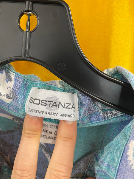 Men's casual shirt by Sostanza, featuring a unique abstract floral and geometric pattern in shades of blue, green, and gray.