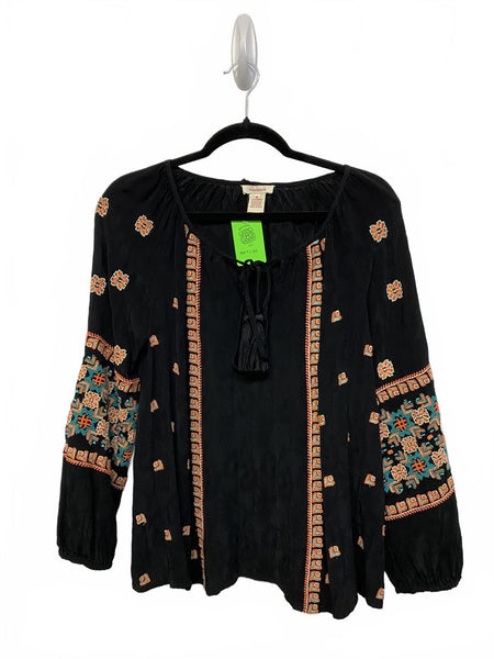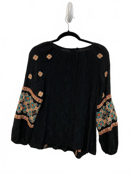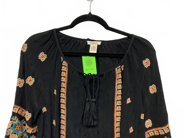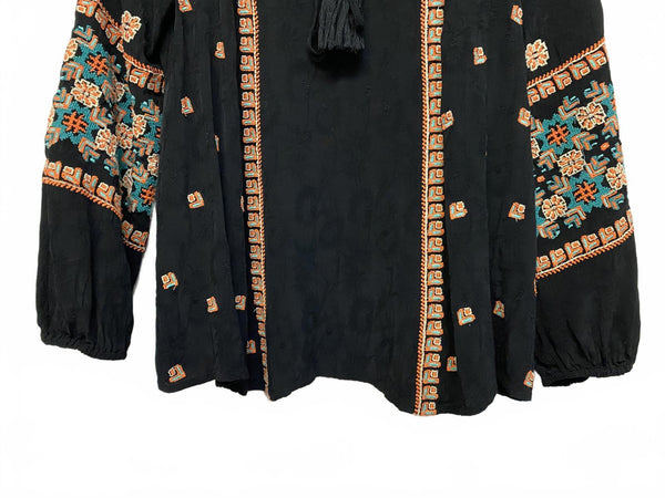 Black blouse by Sundance featuring intricate embroidered floral patterns on the sleeves and front. Lightweight fabric with a subtle jacquard texture. Long sleeves with elastic cuffs and a tassel tie at the neckline. Bohemian style perfect for casual or dressy occasions. Slight fraying at the middle of tassel neck tie & at back collar. Overall, in excellent condition 100% viscose