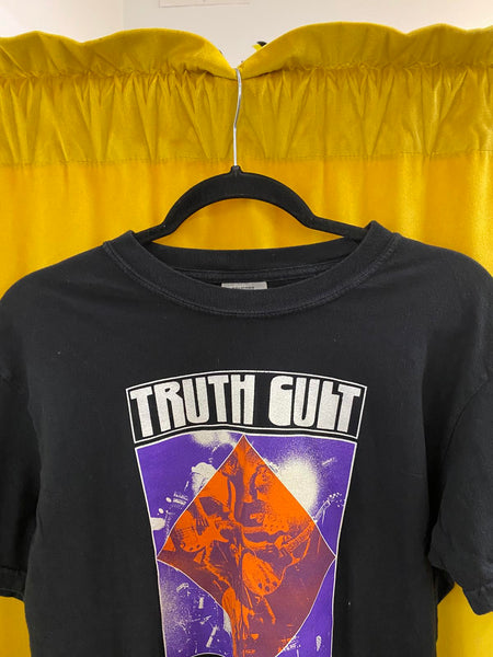 Men's black t-shirt featuring a bold 'Truth Cult' graphic in orange and purple on the front.