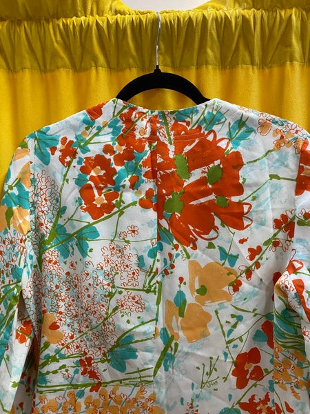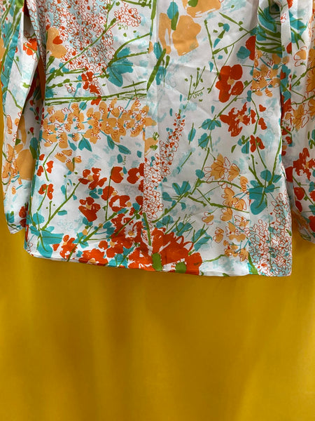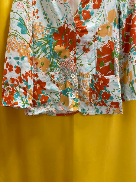 Lightweight floral blazer jacket with vibrant orange, teal, and beige flower patterns.