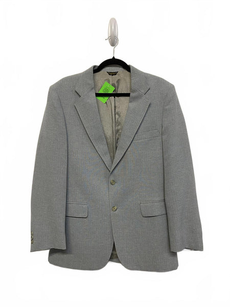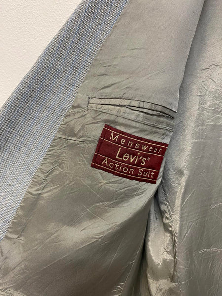 Classic vintage Levi’s men's suit jacket in a versatile gray light blue color. Features a two-button front closure, notch lapels, and flap pockets. Fully lined interior for comfort and style. Suitable for business or formal occasions. In very nice condition, no flaws to be found. Size 40R
