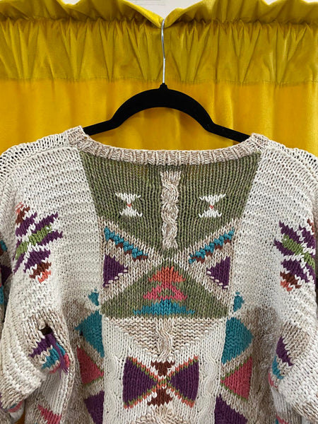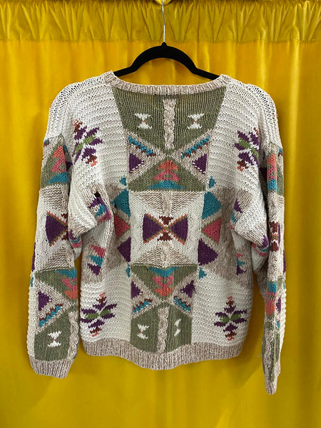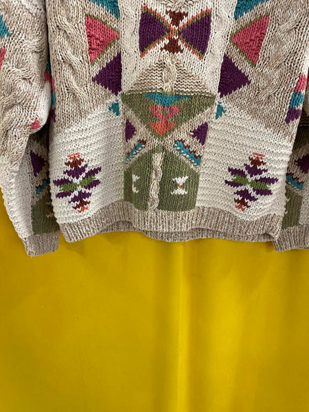 Vintage Woolrich women's sweater featuring a unique geometric pattern in multiple colors including beige, green, purple, and teal.
