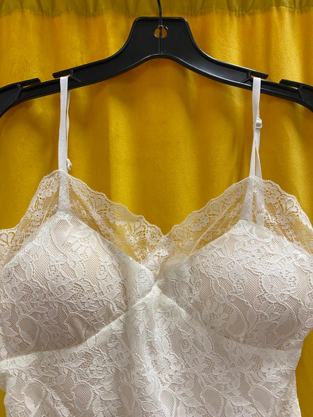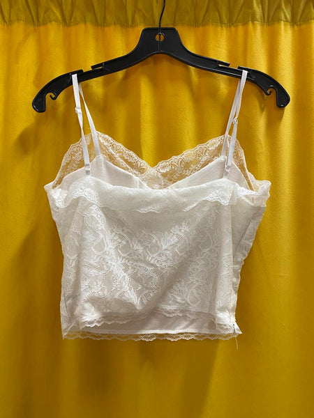 Elegant white lace camisole tank top for women.