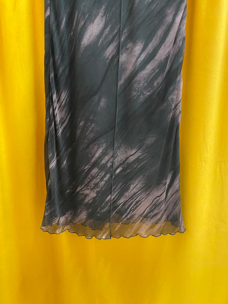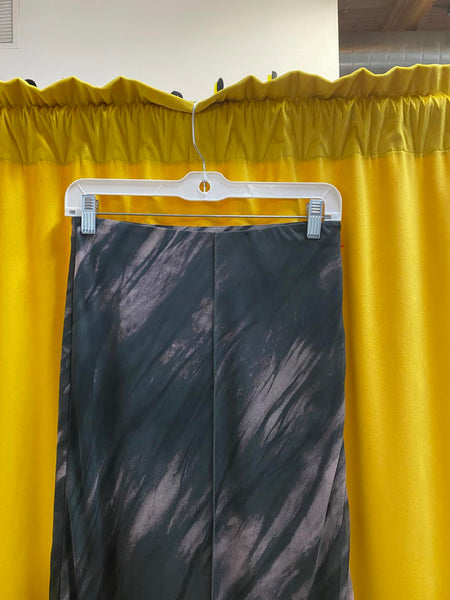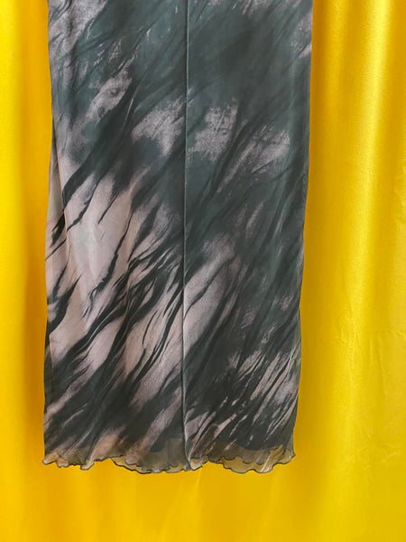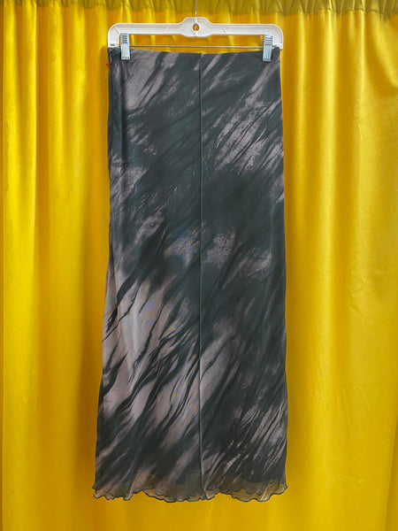 ZARA Elegant women's micro mesh grey pink lavender midi skirt featuring a unique abstract pattern in shades of black and gray, slight pink and lavender hues. Cool toned.