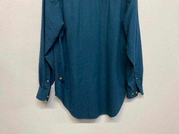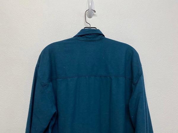 Features long sleeves, buttoned cuffs, and two chest pockets with button flaps.