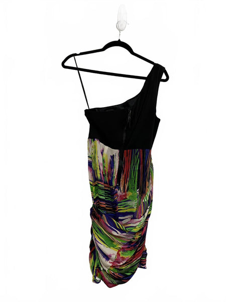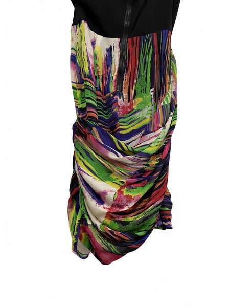 Stylish one-shoulder dress featuring a solid black upper bodice with an asymmetrical neckline and thin strap. The silk skirt showcases a vibrant abstract multicolor print with draped detailing for a flattering fit. Perfect for parties or special occasions.