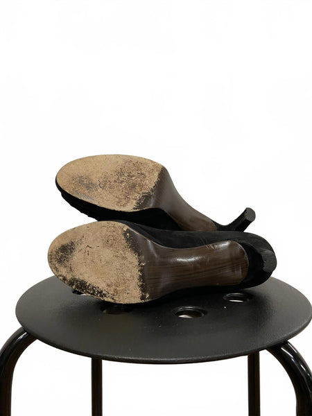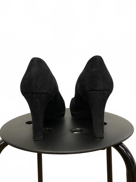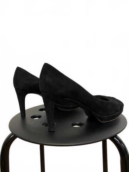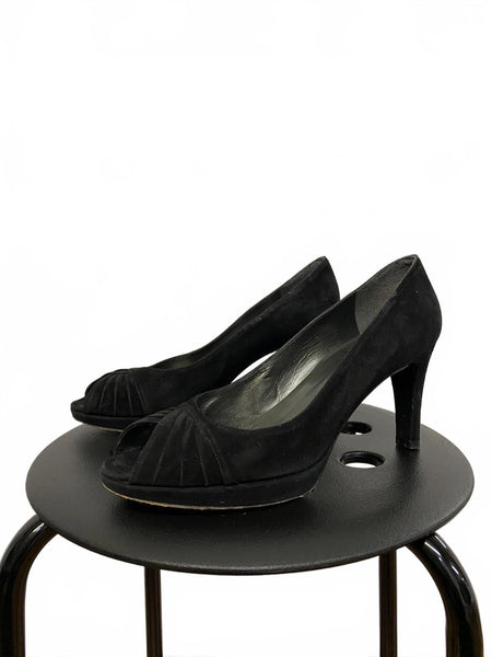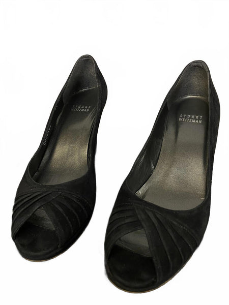 Classic black suede peep toe heels by Stuart Weitzman.