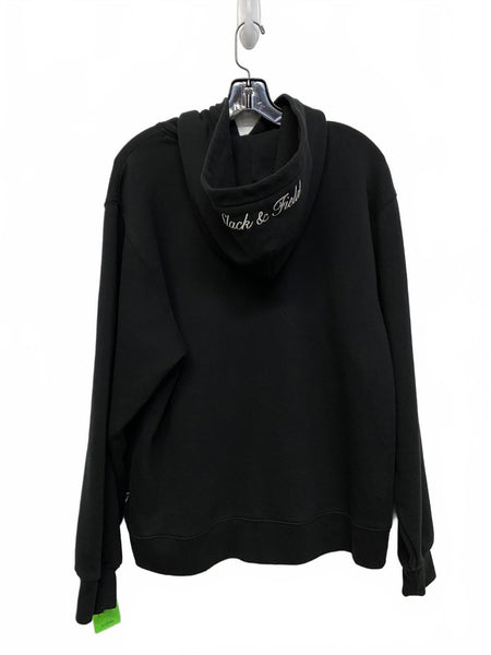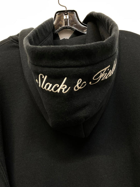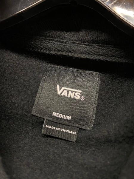 This Vans hoodie features a classic black color with a front logo patch accented by a floral design. It has a comfortable fit and a hood with "Slack & Field" embroidered on the back. Perfect for casual wear or layering in cooler weather. Size Medium, made in Vietnam.