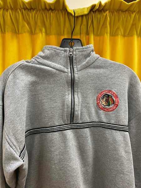 Gray half-zip pullover sweatshirt featuring the Winter Hawks Hockey Club logo on the chest.